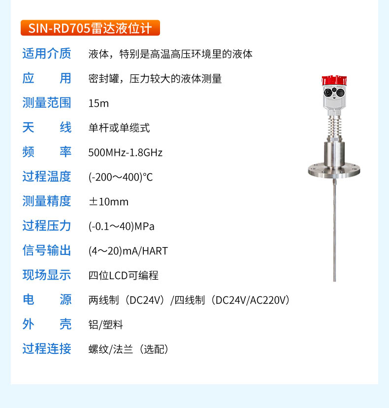 聯(lián)測儀表SIN-RD702導(dǎo)波雷達(dá)液位計發(fā)出的高頻微波脈沖沿著探測組件(鋼纜或鋼棒)傳播, 遇到被測介質(zhì),由于介電常數(shù)突變,引起反射,一部分脈沖能量被反射回來。