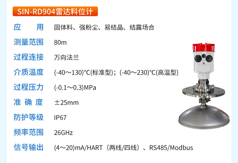 90系列傳感器是26G高頻雷達(dá)式物位測(cè)量?jī)x表,測(cè)量最大距離可達(dá)80米。聯(lián)測(cè)儀表SIN-RD906雷達(dá)液位計(jì)天線被進(jìn)一步優(yōu)化處理,新型快速的微處理器可以進(jìn)行更高速率的信號(hào)分析處理,使得儀表可以用于各種強(qiáng)腐蝕性液體的測(cè)量。