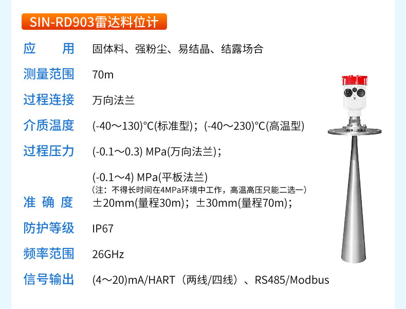 您的位置: 首頁 > 26G高頻雷達物位計 → 聯測儀表SIN-RD905雷達料位計適用于固體顆粒、粉料