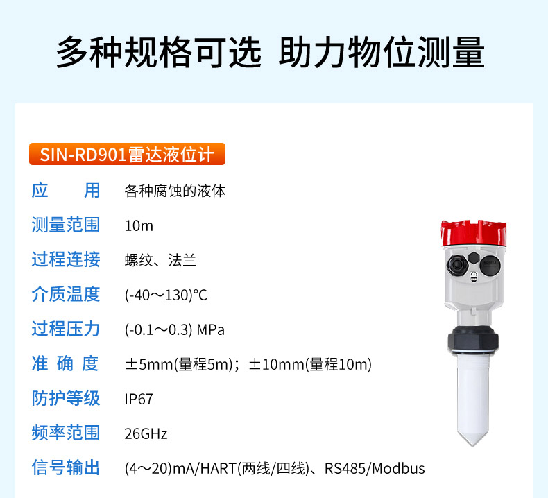 90系列傳感器是26G高頻雷達式物位測量儀表,測量最大距離可達80米。聯測儀表SIN-RD904雷達料位計天線被進一步優化處理,新型快速的微處理器可以進行更高速率的信號分析處理,使得儀表可以用于各種強腐蝕性液體的測量。
