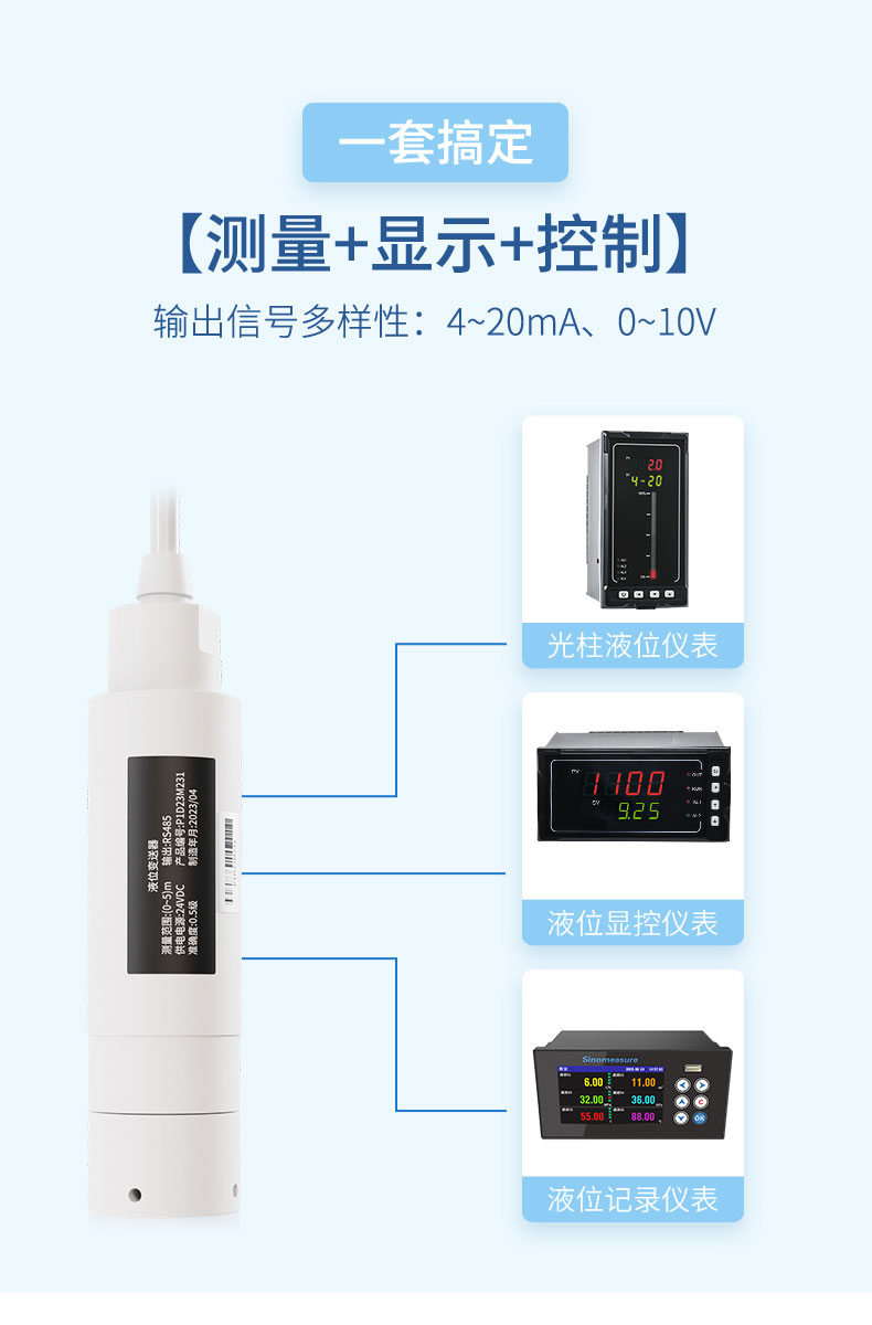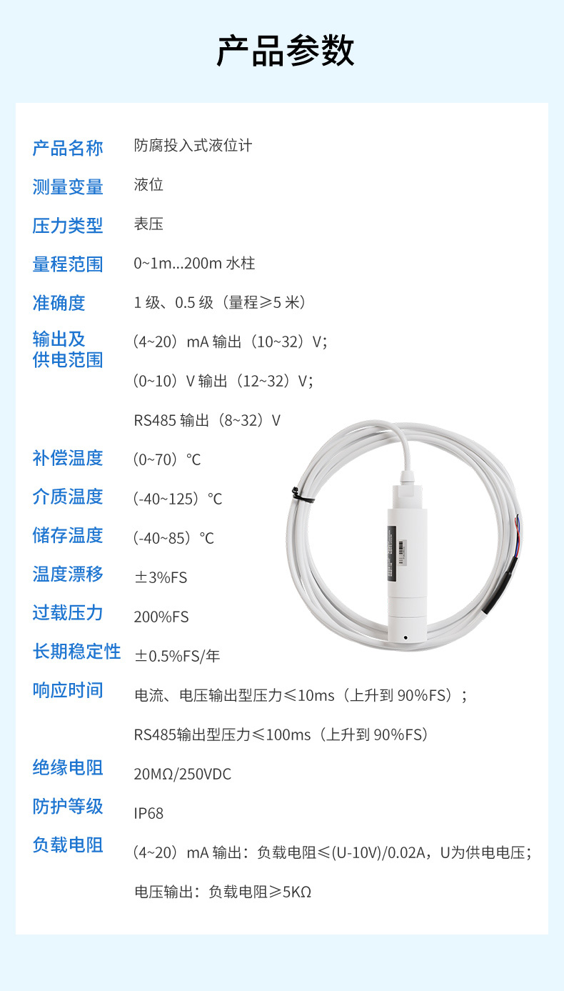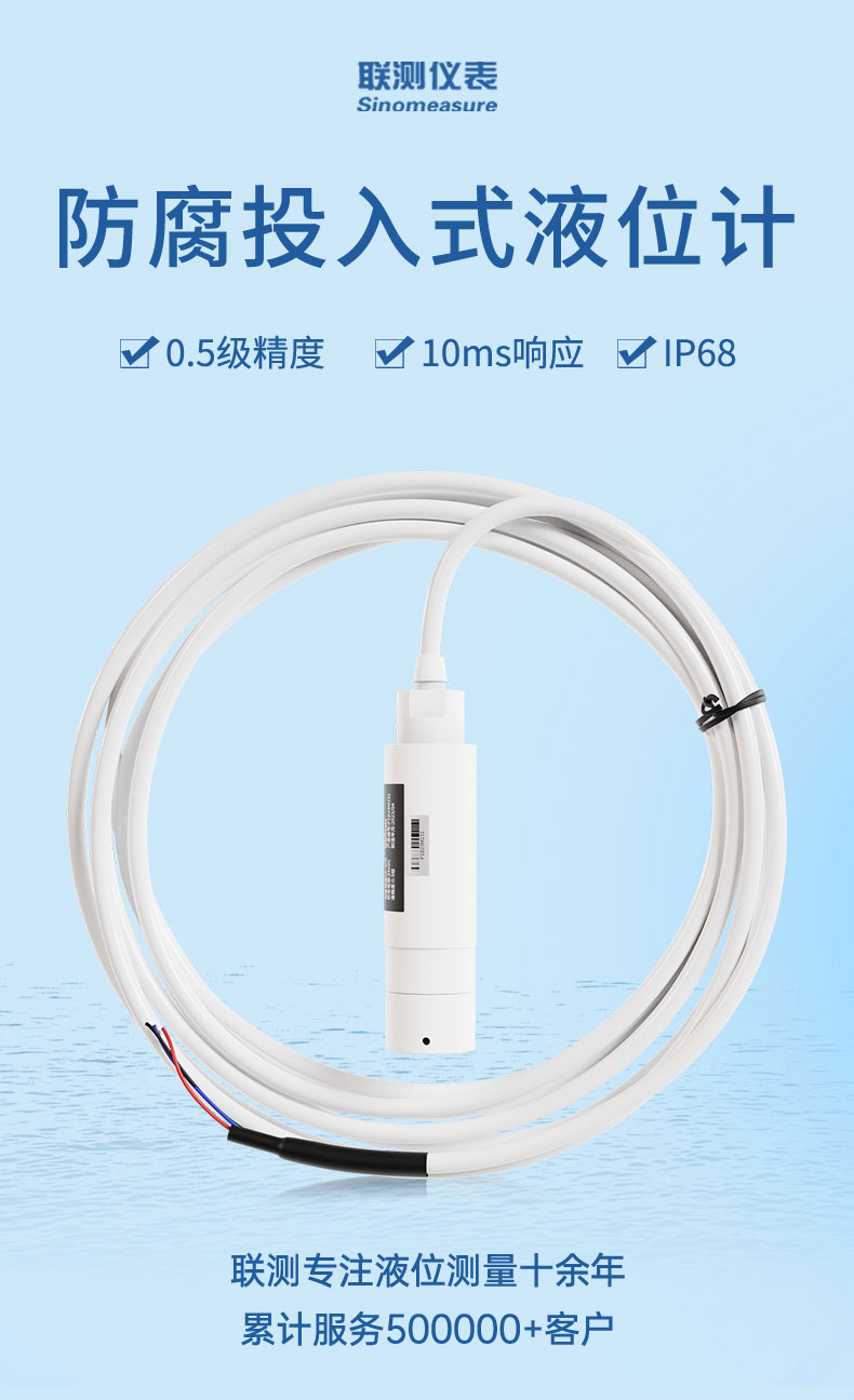 聯(lián)測儀表SIN-P262/P262-B陶瓷芯體防腐投入式液位計(jì)由高性能陶瓷壓力傳感器作為測量元件,把與液位深度成正比的液體靜壓力準(zhǔn)確的測量出來,并經(jīng)過信號(hào)調(diào)理電路轉(zhuǎn)換成標(biāo)準(zhǔn)的電流、電壓或RS485 信號(hào)輸出,建立起輸出信號(hào)與液位深度的線性對(duì)應(yīng)關(guān)系,實(shí)現(xiàn)對(duì)液體深度的測量。產(chǎn)品采用聚四氟乙烯防腐材質(zhì),具有優(yōu)良的耐腐蝕性能,廣泛適用于化工廠酸、堿性等腐蝕介質(zhì)的液位測量。